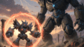 ドラパルトとアーウィンが激しいドッグファイトを繰り広げる様子を描写しています。レーザーの発射やGディフューザーの発光など、それぞれの特徴的なエフェクトを加え、緊迫感と競争意識を高めています。